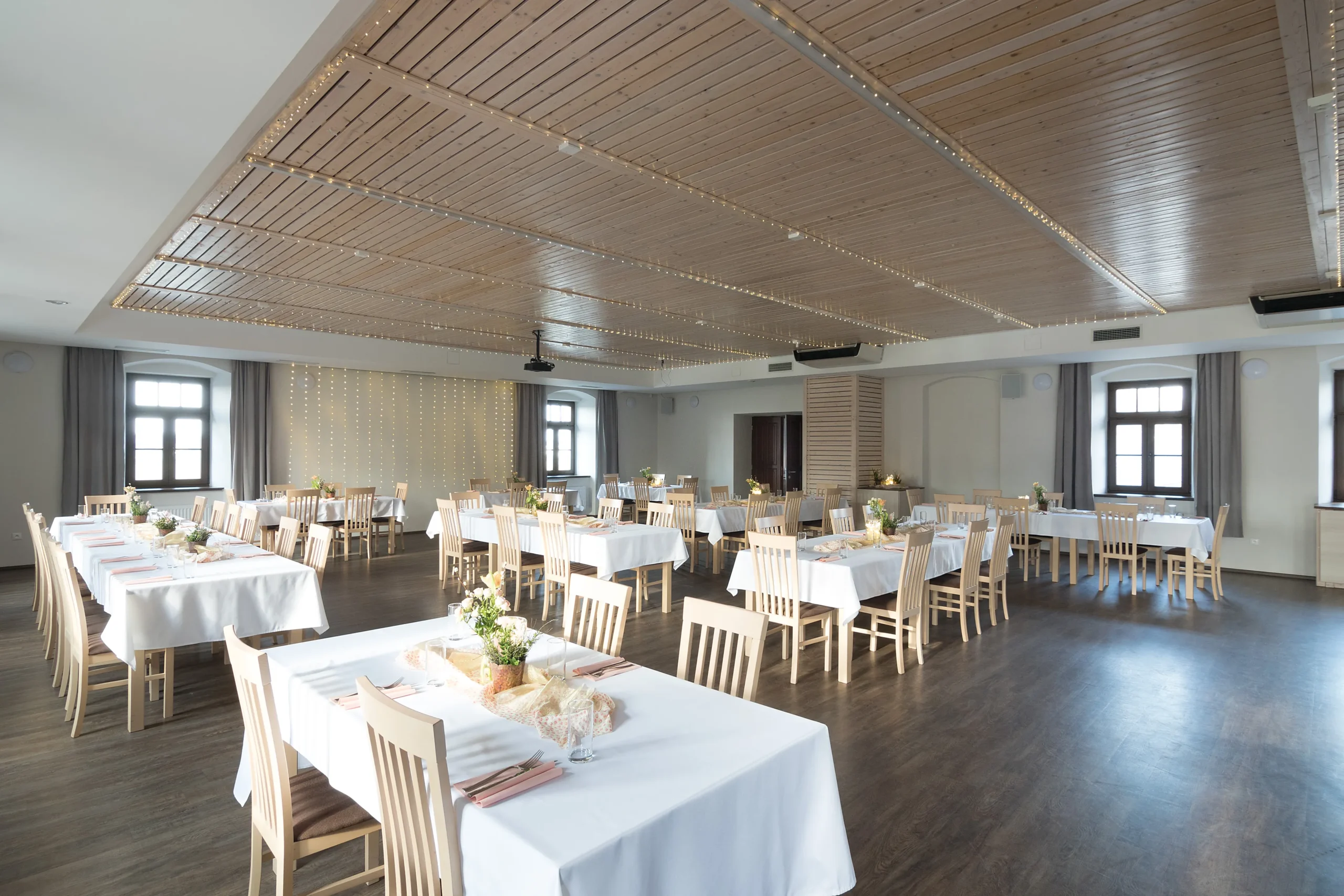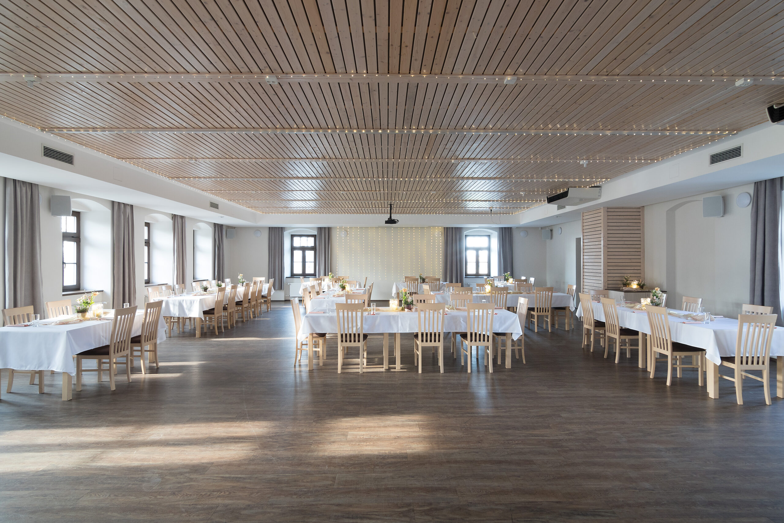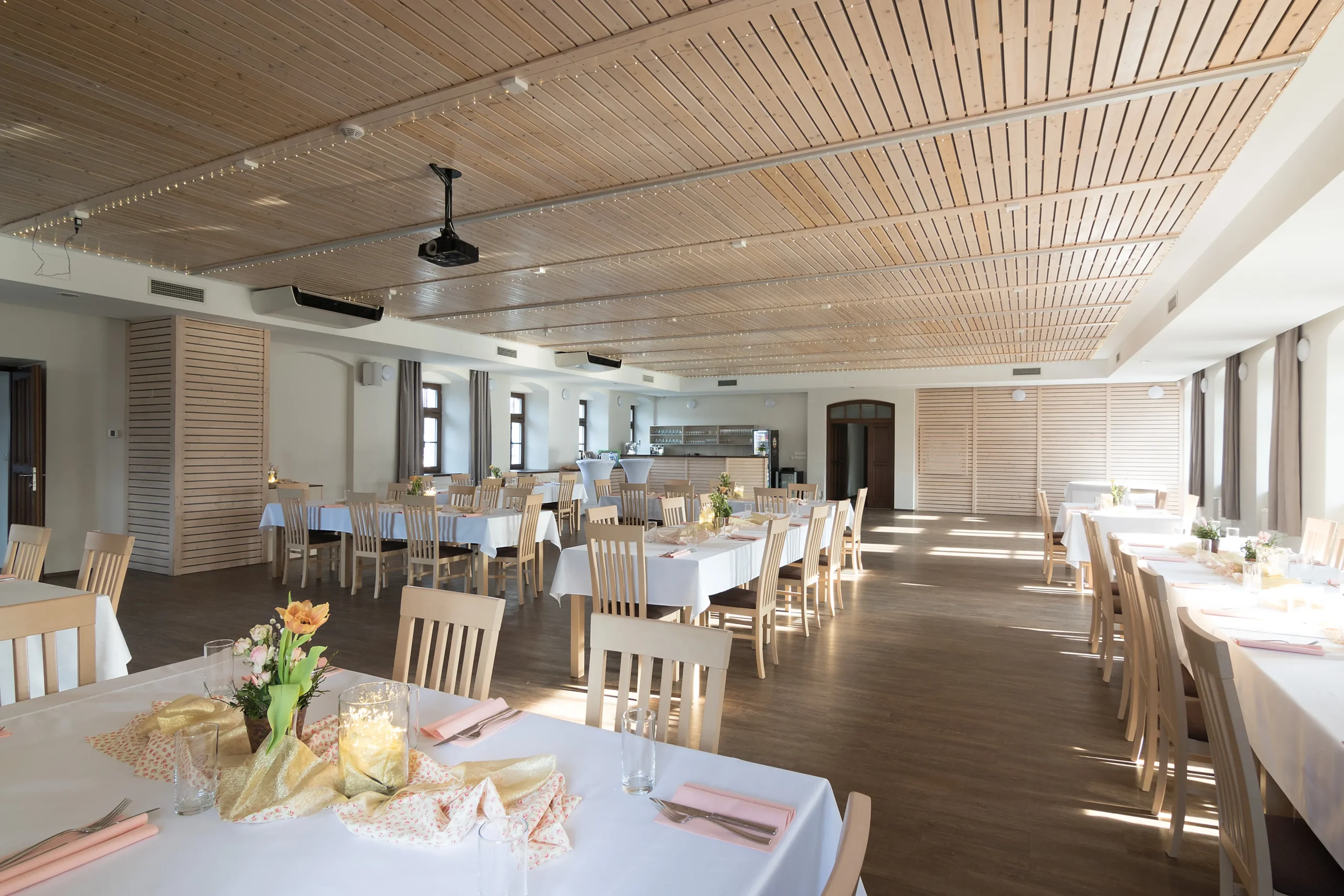 Sál pro 50-110 osob koncipovaný opět v souladu s přírodou v přirozených světlých barvách a s použitím dřevěných prvků, je idealní místo nejen pro svatbu, ale také pro různé rodinné oslavy, firemní večírky, školení zaměstnanců či prezentaci pro obchodní partnery